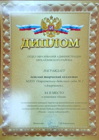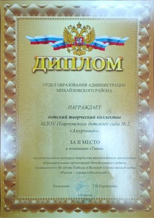 10 апреля на базе ДОУ состоялся показ конкурсных номеров по теме: "Россия - страна победителей" . Жюри были представлены следующие номера: песни "Гвоздика" ( исполнители: М.Комкова, А. Семидей, З. Курнакова) "С мамой, папой на парад" (исполнитель Л. Линник), танец "Казаки в Берлине" исполнители дети старшей и подготовительной групп; стихотворение "Дети из ладошек солнышко сложили" в исполнении В. Савенок. Итогом муниципального конкурса стало присуждение 2 места.